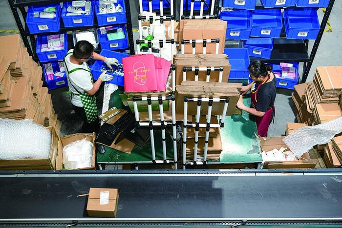 近日,位于樟樹市的仁和智慧醫(yī)藥物流園,工人在自動化傳輸帶上打包藥品快遞。