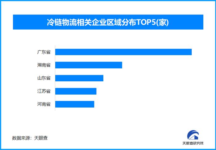 天眼查專業(yè)版數(shù)據(jù)顯示,截至目前我國(guó)現(xiàn)存在業(yè)、存續(xù)狀態(tài)的冷鏈物流相關(guān)企業(yè)超4.6萬(wàn)家。從區(qū)域分布來(lái)看,廣東、湖南以及山東,三地相關(guān)企業(yè)數(shù)量位居前列,分別擁有9400余家、4600余家以及3300余家。
